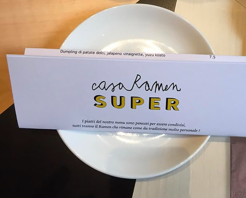 Casa Ramen Superの料理は日本からインスピレーションを得ていますが、使用する食材はすべてイタリアの小規模生産者から仕入れたものを使用しており、メニューには「心は日本に、胃袋はイタリアに」というコンセプトが記されており