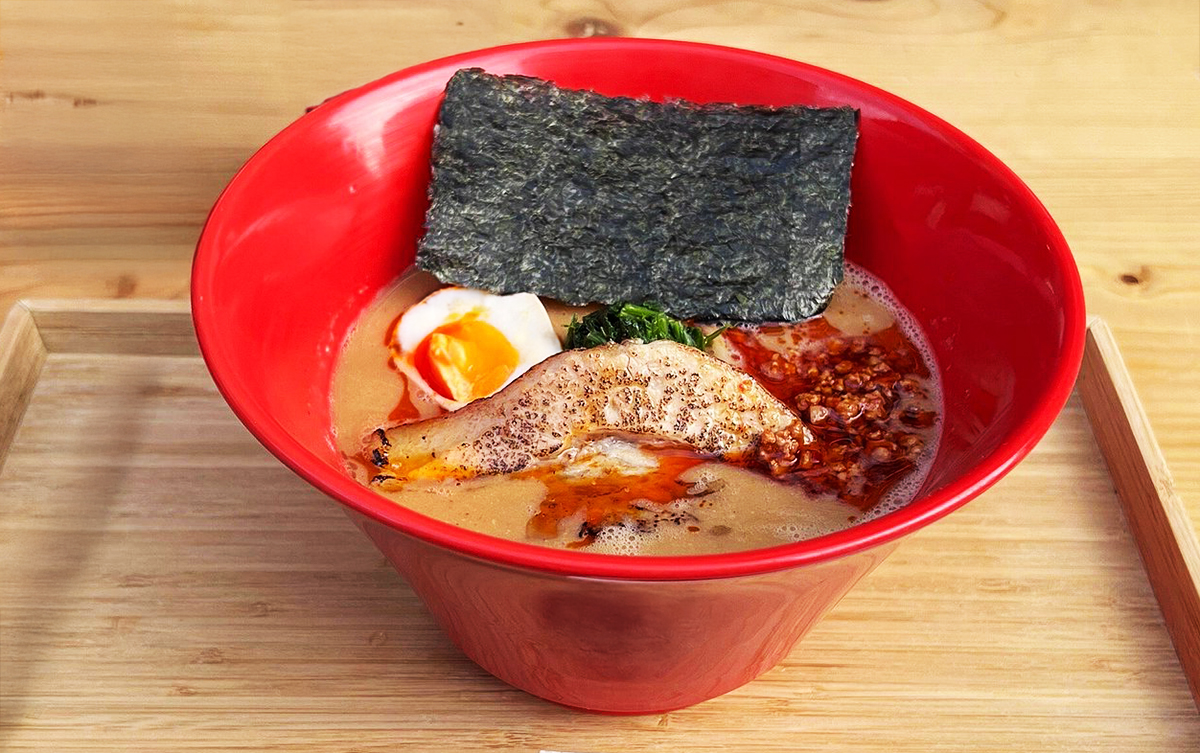 「辛味噌豚骨ラーメン」は、濃厚な豚骨スープにピリッとした辛味を加えた、刺激的で奥深い味わいが楽しめる一杯です。味噌の風味と自家製スパイシーソースが絶妙に融合し、寒い日や濃厚なラーメンを求める方にぴったりのメニューです。
