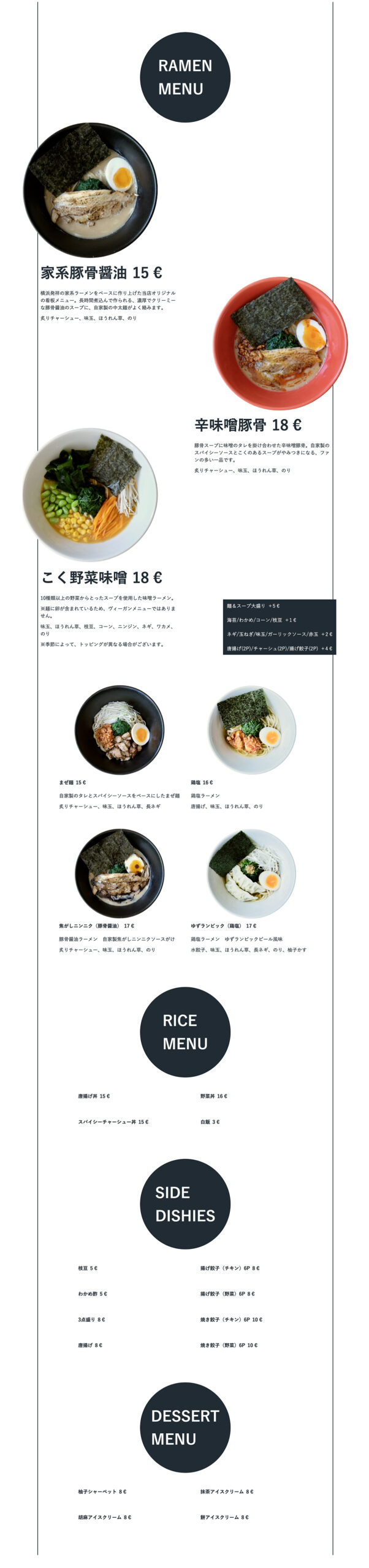 「家系豚骨醤油ラーメン」のスープは、豚骨と鶏ガラを長時間じっくり煮込んで作られています。醤油のまろやかさと豚骨のクリーミーなコクが絶妙に融合し、一口食べるごとに奥深い味わいが広がります。麺はスープとの絡みを考えた中太ストレート麺を使用。店内で製麺された新鮮な麺は、もちもちとした食感と滑らかな喉ごしが特徴で、家系ラーメンをベルギーで忠実に再現した一杯。